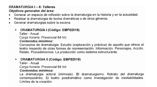 Se requiere que el/la aspirante se centre en la enseñanza de la dramaturgia, y que su propuesta pedagógica se corresponda con los contenidos mínimos pautados. Que posea una probada experiencia en lo profesional, en su relación con instituciones educativas y amplios antecedentes en el trabajo pedagógico con grupos de estudiantes. Se pondrá una especial consideración hacia su compromiso con la educación pública, siendo necesario que pueda desempeñar una firme voluntad de trabajo en equipo y articulación con el resto de las materias de las carreras y cursos según la identidad de la EMAD que la distingue de otras escuelas de formación.
