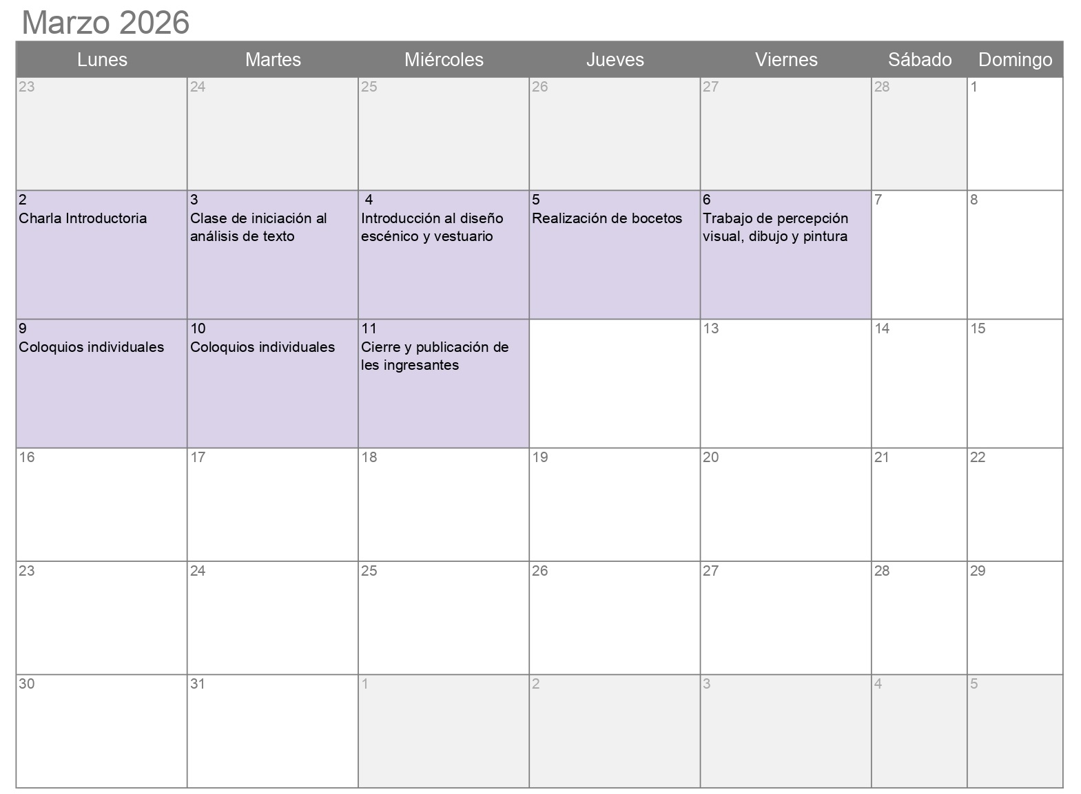 - Realización de bocetos: de espacio y vestuario (figurín) en función de las obras a trabajar.