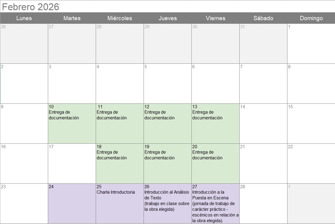 - Introducción a la Puesta en Escena (dos -2- jornadas de trabajo de carácter práctico – escénicos en relación a la obra elegida).